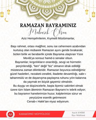 Bu duygu ve düşüncelerle, başta ilçemiz sakinleri olmak üzere tüm İslam âleminin Ramazan Bayramı’nı tebrik ediyor; bu bayramın hanelerimize huzur, kalplerimize sürur ve yeryüzüne esenlik getirmesini