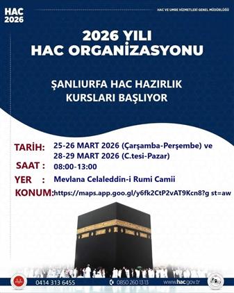 2026 yılında hacca gidecek vatandaşlarımıza yönelik hac hazırlık kursları 25-26 Mart 28-29 Mart tarihleri arasında Haliliye ilçesi Mevlana Celaleddin Rumi Camisi'nden yapılacaktır.